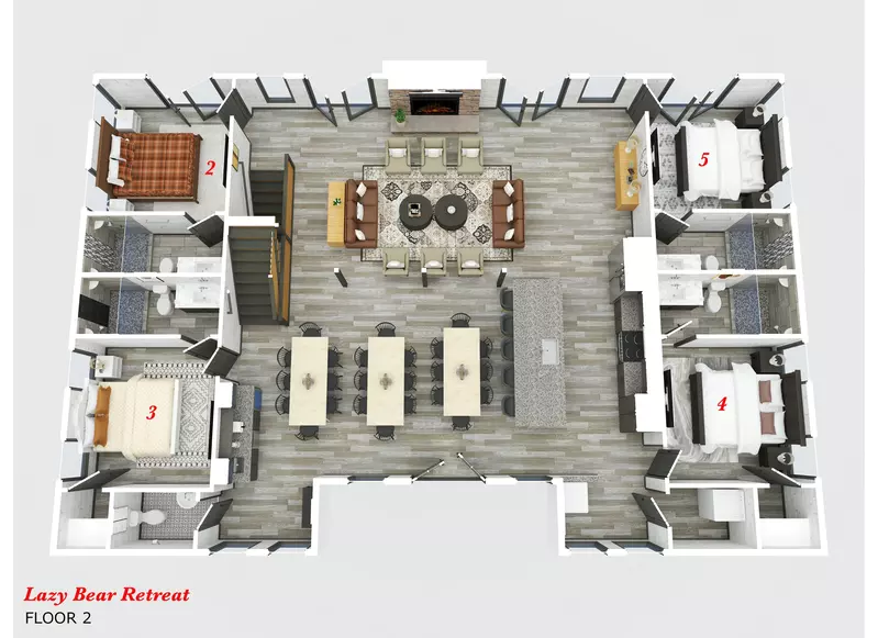 The mid-level of the lodge features a fully equipped kitchen, two dining room tables, granite countertops, and bar seating. This level boasts an open floor plan with the kitchen, dining room, and living room all together. The living room has lots of comfortable seating and wraps around a tall stacked stone fireplace. There's also a large TV on the mantle, and another laundry room and a half bathroom. There are four bedrooms on this level, each with a king bed and its own private bathroom. Additionally, there is a large covered porch with plenty of seating and a charcoal grill.